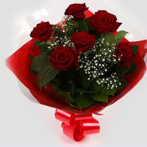 A beautifully gift wrapped luxury stemmed six red large headed roses presented with gyp & salal.