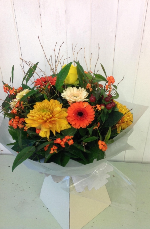 Beautiful tones of orange and yellow flowers delivered in a handtied box with water.