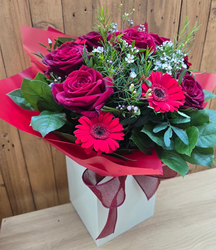 Roses and germinis make the perfect couple when combined in this timeless and romantic gift that’s sure to impress.