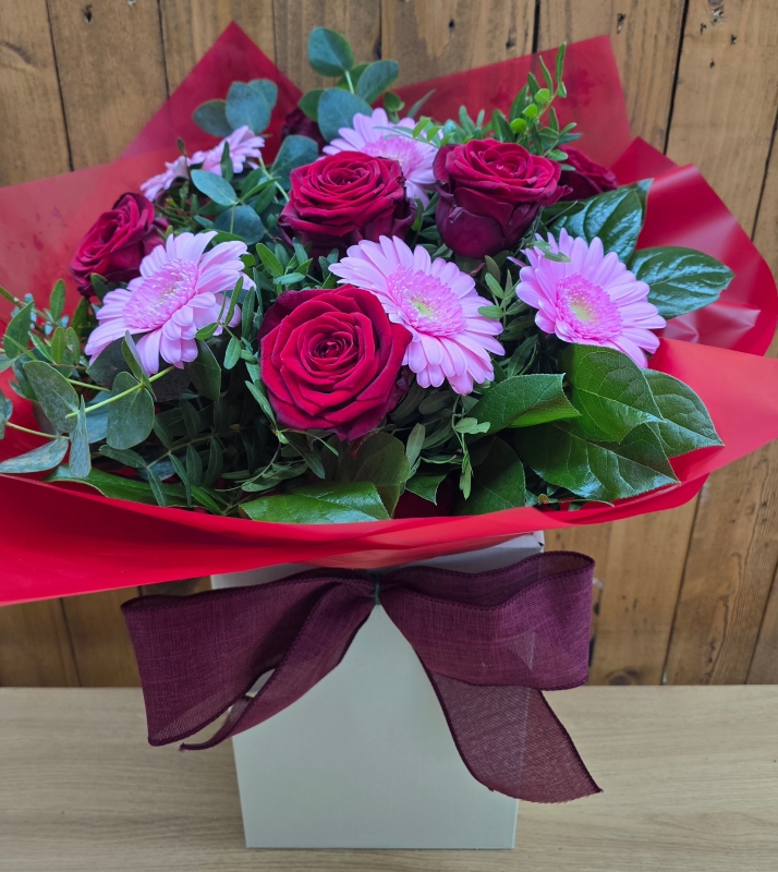 Nothing says romance like red roses and pink germinis, presented in a box with water